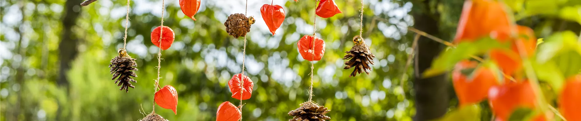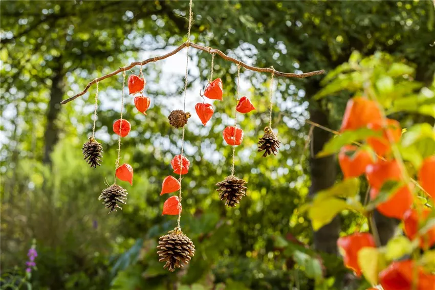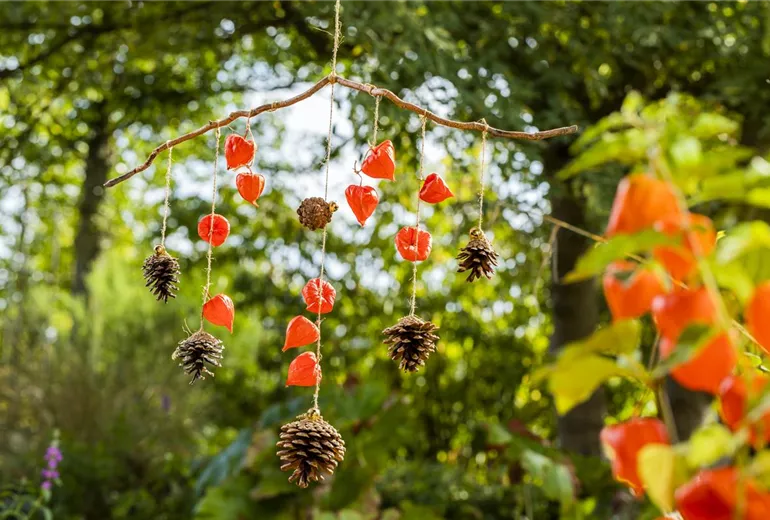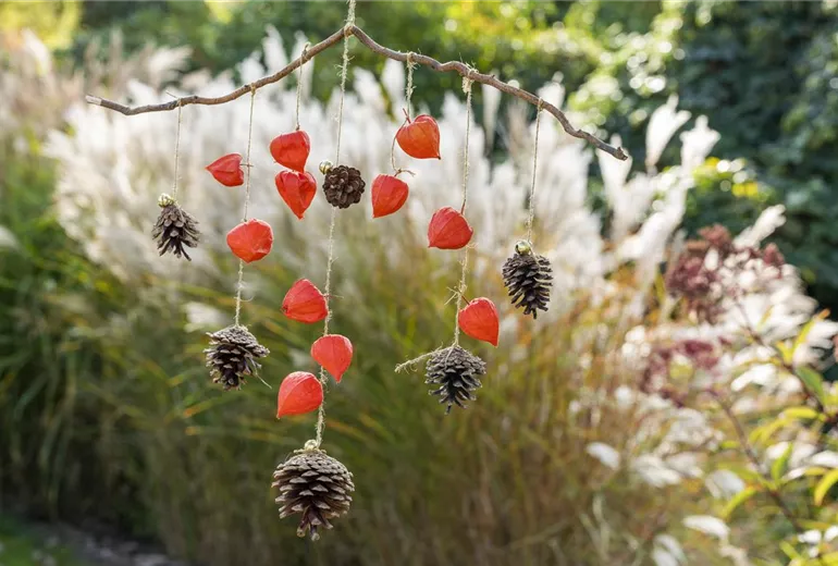 Ein herbstliches Windspiel aus Physalis und Tannenzapfen
